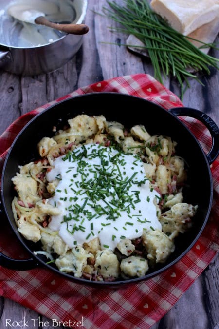 Petit conseil, il faut absolument que l’eau soit bouillante avant de plonger les Kaseknepfle, sinon, ils risquent de se déliter. Pour se donner bonne conscience, accompagner ce plat d’une petite salade verte !